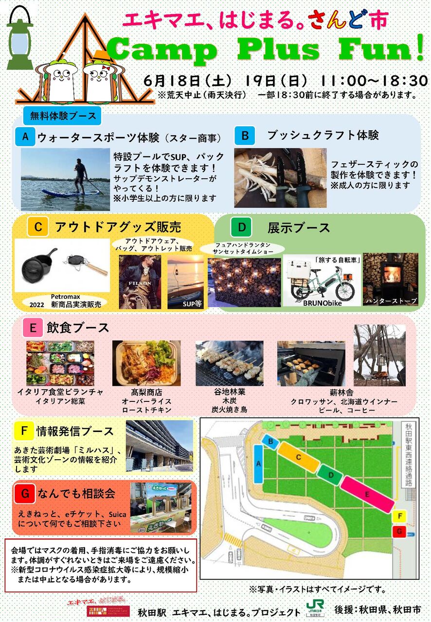 キャンプだけでなく、ウォータースポーツ、ブッシュクラフト、登山、自転車ツーリングなどのキャンプにプラスして楽しめる展示販売・体験ブースを設置いたします。「キャンプだけじゃない」更なるアウトドアアクティビティーを提案するイベントです。
